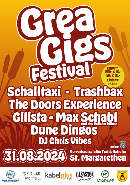 Und schon jetzt kann sich das bisher fixierte Line-Up der zweiten Auflage des Grea Gigs Festivals am 31. August 2024 mehr als sehen und vor allem hören lassen: Max Schabl wird mit seiner Band „Das Volk der Mäuse“ eindrucksvoll demonstrieren, warum er seit Jahren Burgenlands Mundart-Austropop-Aushängeschild Nummer Eins ist. Neben den Lokalmatadoren und Kult-Rockern „Gilista“ sowie den ortsansässigen Cover-Spezialisten von „Schalltaxi“ wird die Partyband „Trashbax“ die Menge zurück in die einzigartige Glam- und Hair-Rock Ära der 80iger-Jahre katapultieren. Als absolutes Highlight dürfen sich die Festival-Besucher auf die zweifelsohne beste „The Doors“-Tributeband Mitteleuropas freuen: „The Doors Experience“ nehmen uns alle mit auf eine unvergessliche Reise in die späten 60er und frühen 70er Jahre und lassen den legendären Jim Morrison einmal mehr hochleben. Aber das ist noch lange nicht alles: Ein erweitertes Kulinarik-Angebot, eine noch größere Bühne sowie ein Überraschungs-Act werden am 31. August 2024 am Tennisplatz St. Margarethen alle Festival-Herzen höherschlagen lassen!
