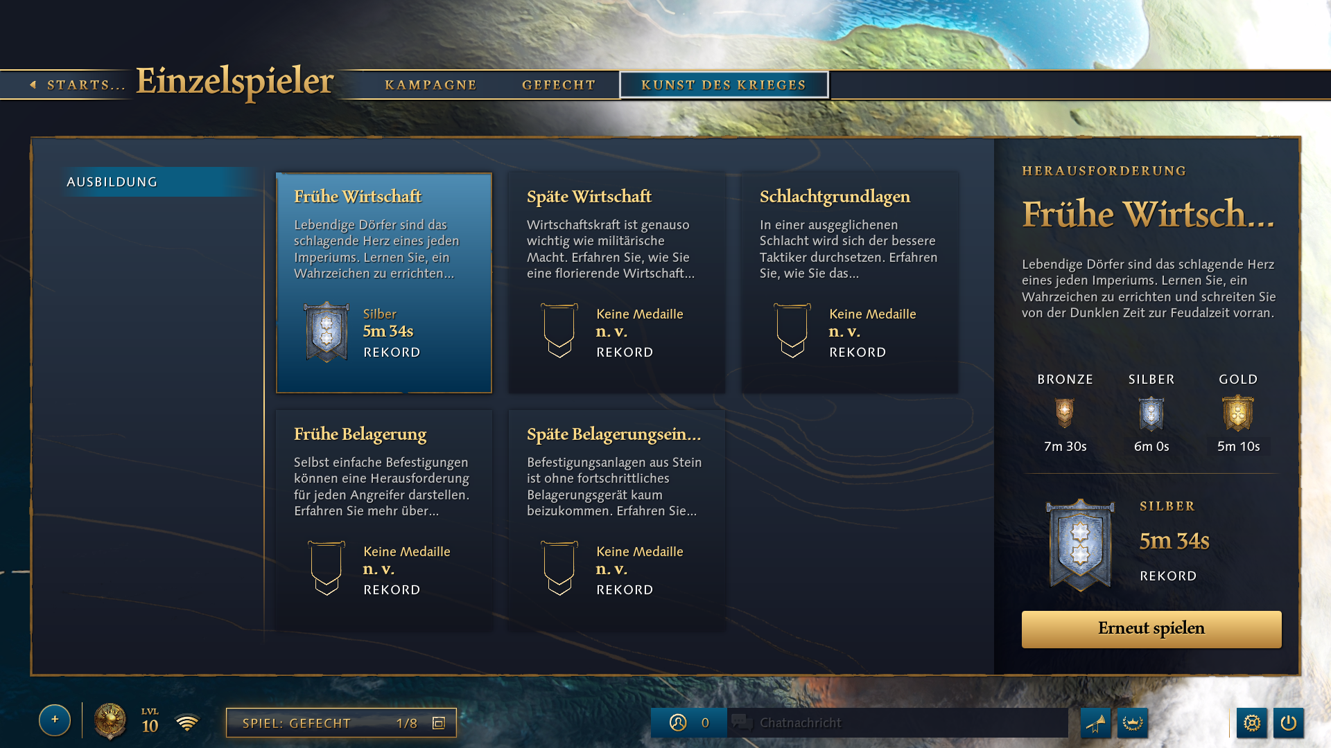 Unabhängig von dem Kampagnenmodus gibt es einen Übungsmodus. In diesem werden uns unterschiedliche Situationen, die während AoE auf uns zukommen, erklärt. Absolvieren wir diese Situation erhalten wir je nach unserem Können eine Bewertung  im klassischen Medaillen-Prinzip. Wer also möchte kann in jeder Kategorie nach Gold streben. Zusätzlich winken ein paar Erfahrungspunkte für unseren Account.