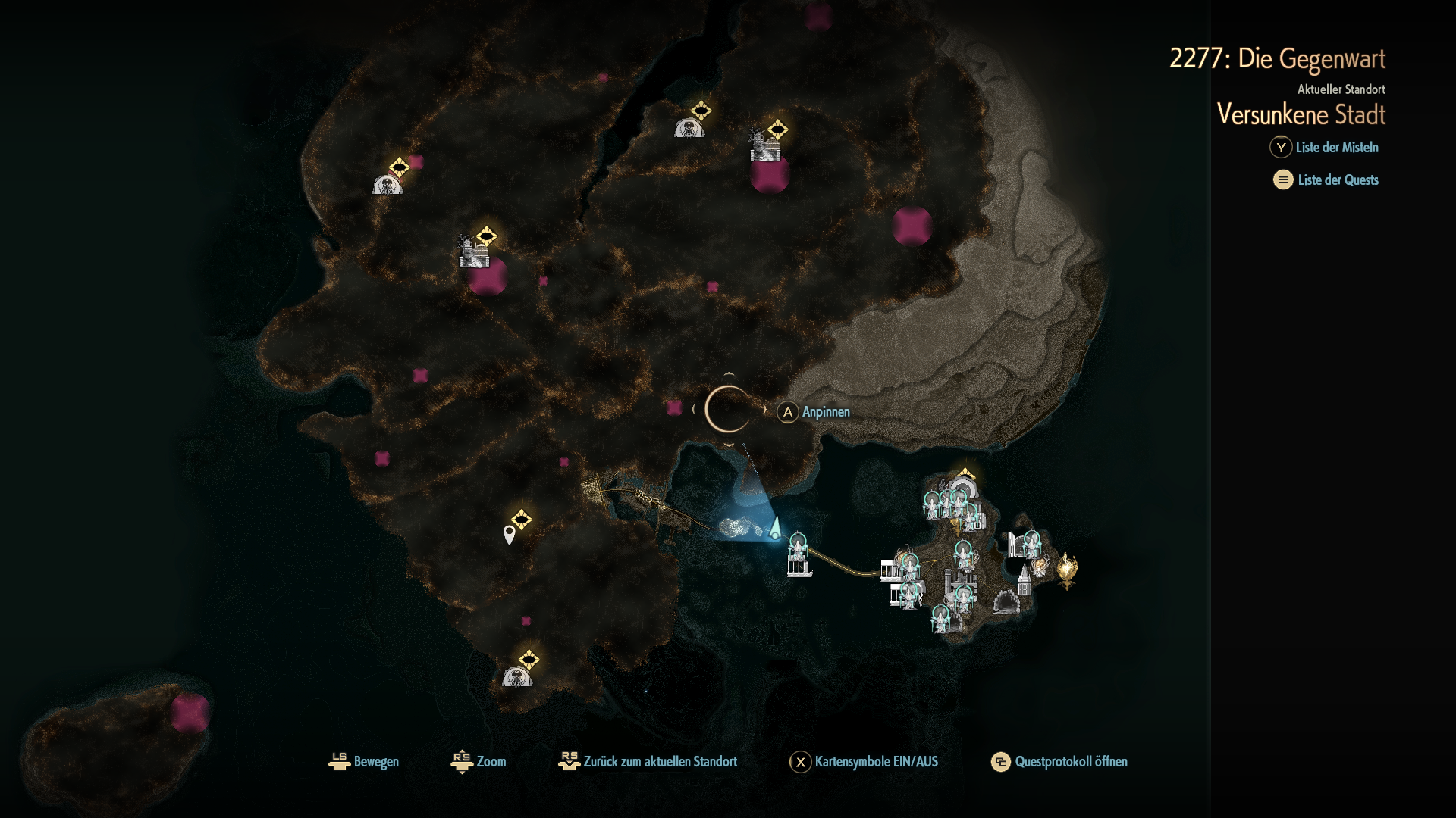 Beim Erkunden selbst ist es ebenso. Die Minimap und Weltkarte sind zu Beginn noch unerforscht und ausgegraut. Ihr könnt aber Kartenunterbrecher finden und diese zerstören und so einen Teil der Weltmap oder eures Dungeons freischalten. Somit irrt ihr nur einen Teil des Spieles ohne Karte umher, wenn ihr das wollt. Auf der Weltkarte werden außerdem wichtige Elemente hervorgehoben. So erkennt ihr dann leichter einen Dungeoneingang, Gebäude oder Sammelobjekte, die euch bei eurer Reise unterstützen.