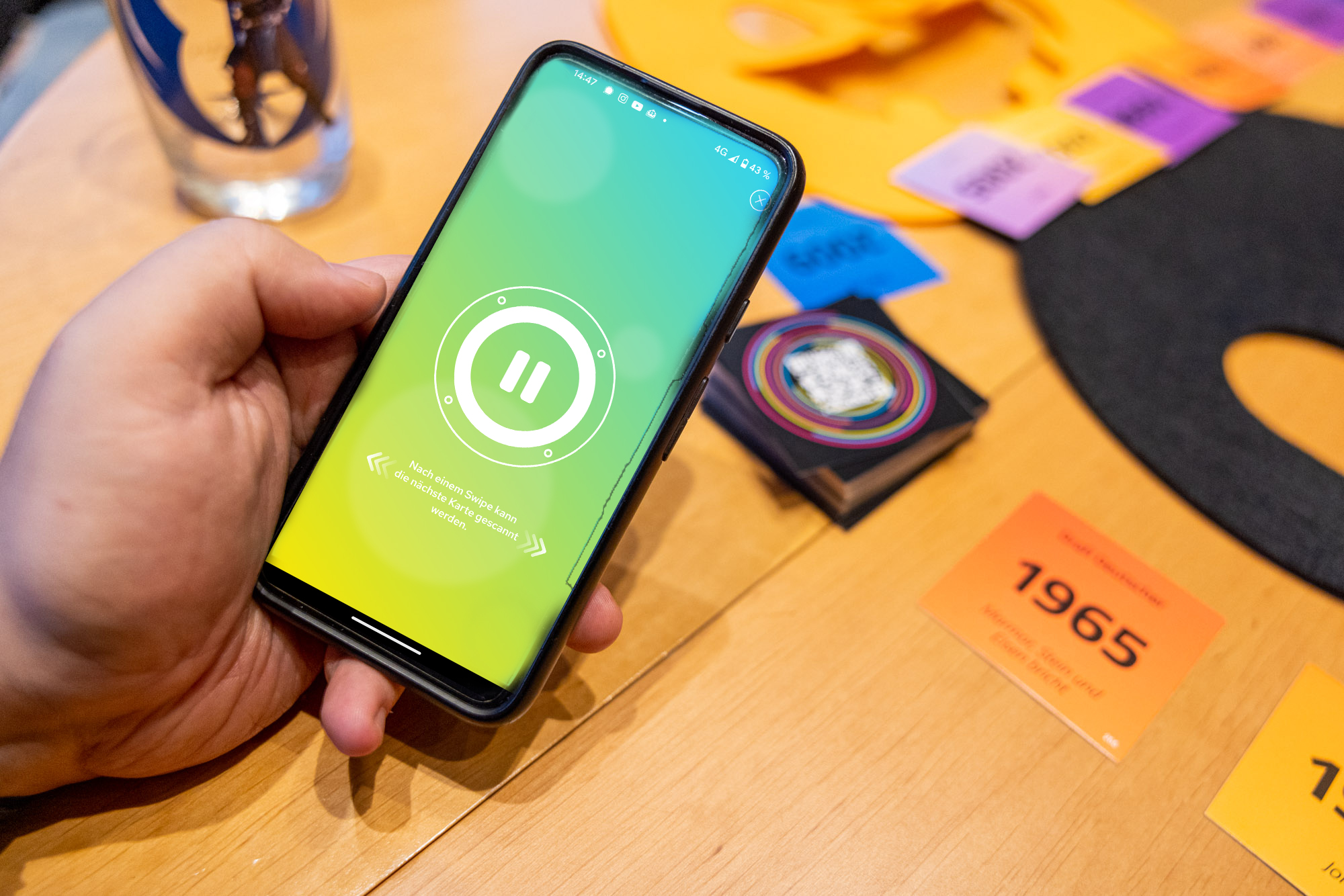 Euer Spielleiter und DJ spielt für euch den nächsten Track anhand eines QR Codes auf der Karte ab. Mit dem Smartphone eingescannt – schon läuft der Track (dank Spotify) an und das Raten kann beginnen. Dann heißt es richtig einordnen. Ihr legt das noch verdeckte Kärtchen in eurer Timeline ab und wenn ihr euch für eine Platzierung entschieden habt wird die Karte umgedreht und kontrolliert. Stimmt die Platzierung, dann bleibt die Karte in eurer Timeline liegen, ansonsten wandert der Song auf einen Ablagestapel.