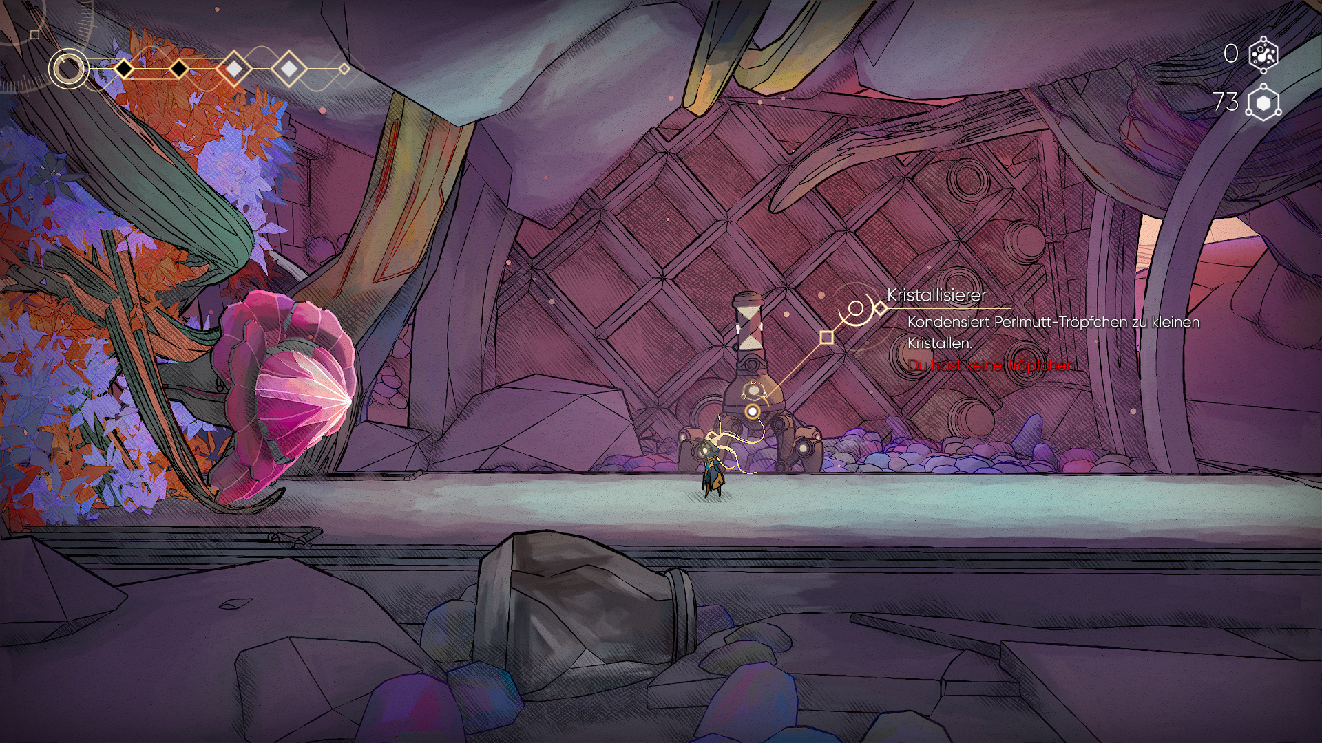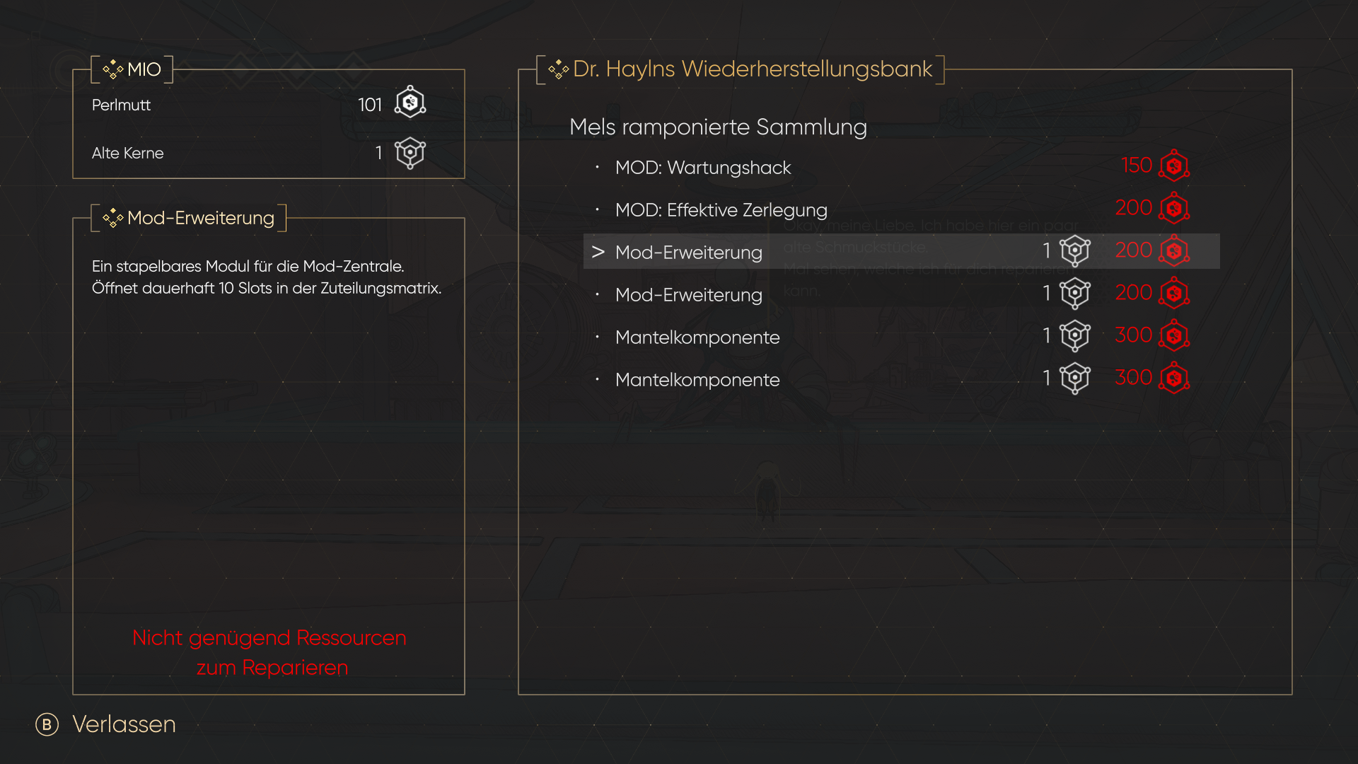 Perlmut erlangt ihr durch das erledigen von Gegnern oder Sammeln von Behältern oder Schrottsammlungen. Diese Währung benötigt ihr für neue Mods oder zum Nutzen von Perlmutbecken, an denen ihr eure Gesundheit wiederherstellen könnt. Aber Achtung, denn solltet ihr eure Perlmuttropfen nicht bei einem der Roboter in Kristalle umwandeln verliert ihr die aktuelle Anzahl an Tropfen bei eurem Ableben wieder. Daher solltet ihr immer versuchen eure Perlmuttropfen auszugeben oder in Kristalle umzuwandeln. Die zweite Währung neben Perlmut sind alte Kerne, die ihr von ausrangierten Robotern bekommt. Manche Mods benötigen eine unterschiedliche Anzahl von Kernen um beim Händler gekauft werden zu können.