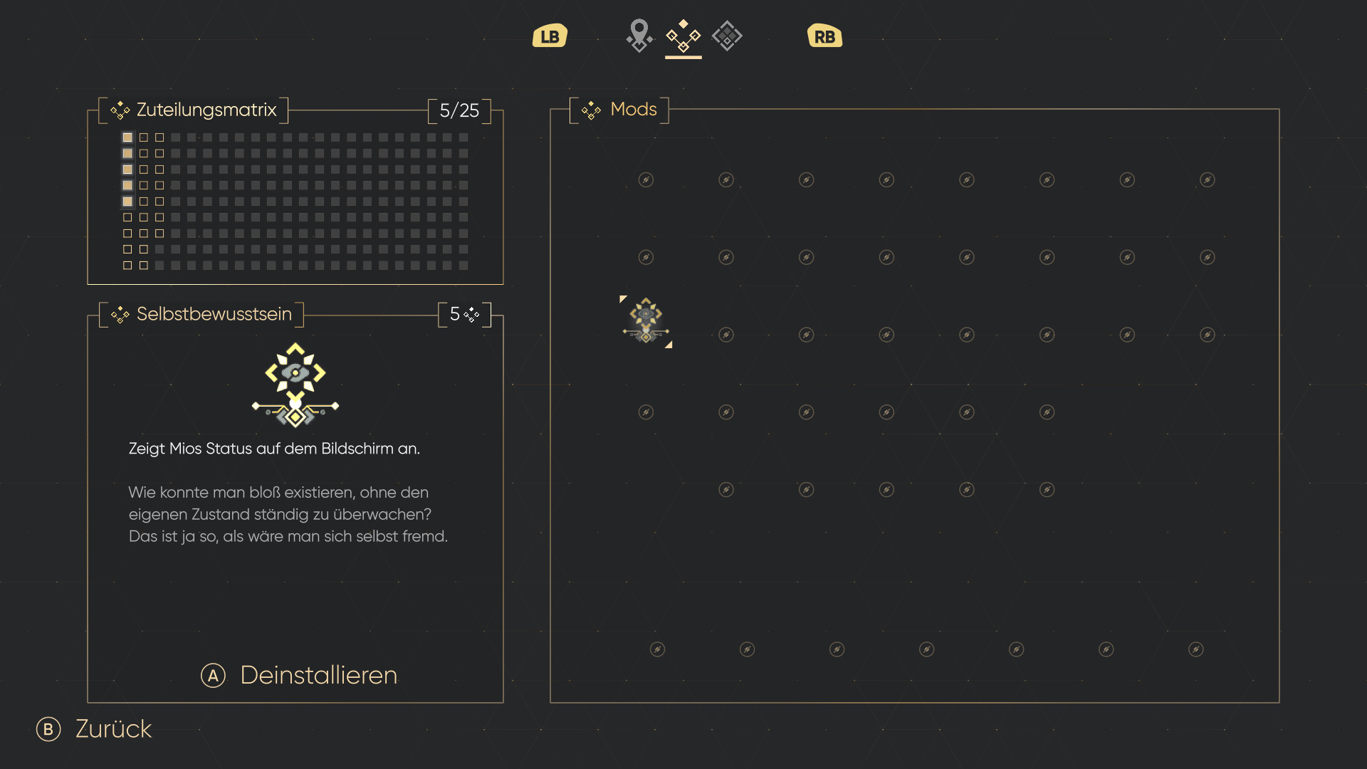 Neben diesen genannten permanenten Fähigkeiten verfügt ihr in MIO über passive Mods. Diese könnt ihr entweder in der Spielewelt finden oder euch später bei einem Händler für wertvollen Perlmut, die Hauptwährung, kaufen. Jeder Mod bringt einen kleinen Twist in das Gameplay und verbraucht entsprechend Kapazitäten eurer Zuteilungsmatrix. Entsprechend eurem können oder Ziel und den aktuell erlangten Mods erwischen wir uns immer wieder am feintunen für die nächste Herausforderung.