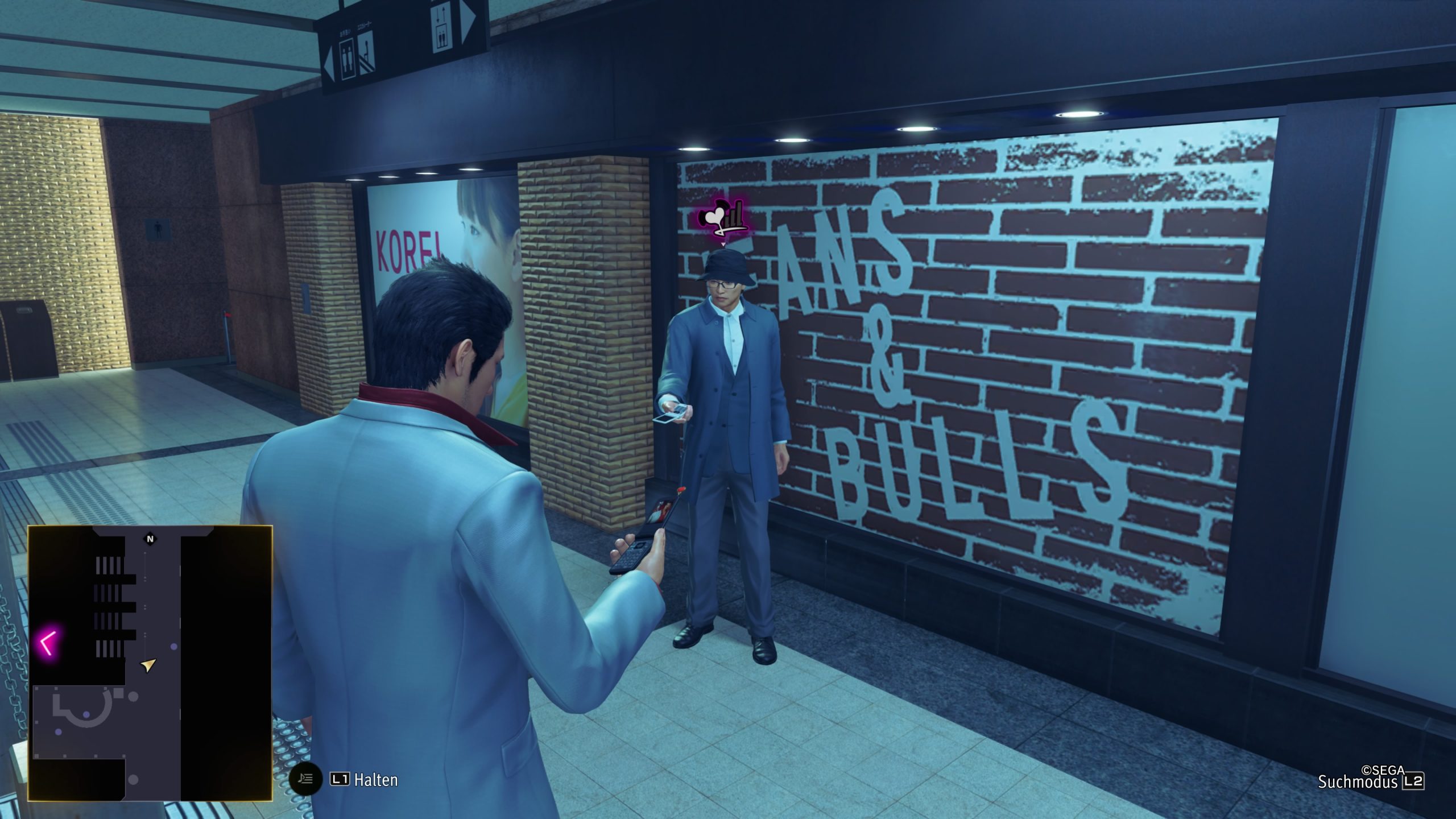 Außerdem bekommt ihr ein Klapphandy das ihr individuell Anpassen könnt und je nach gewählter Antenne und Hintergrundbild die Eigenschaften eures Charakters oder des Spiels für die Nebenaktivitäten beeinflussen könnt. Außerdem könnt ihr mittels „LaLaLa Lovelies“ mit einigen frei rumlaufenden NPCs, ähnlich zur Aloa Funktion bei Like a Dragon, eine Freundschaft aufbauen.